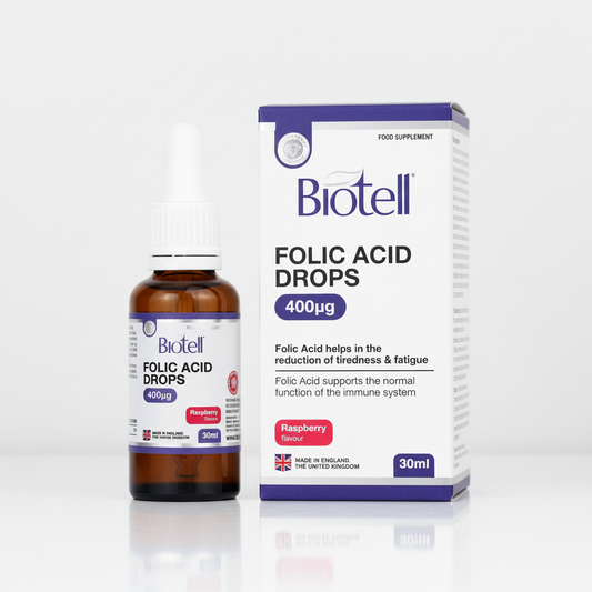 Biotell Folic Acid Drops 400µg support normal blood formation, energy metabolism, and maternal health during pregnancy. Easy-to-use daily liquid drops.