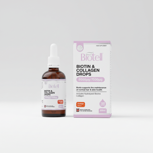 High-strength Biotin & Collagen Drops from Biotell with 5000μg Biotin & 7500μg Collagen. Supports healthy hair, glowing skin & strong nails. Easy liquid format.
