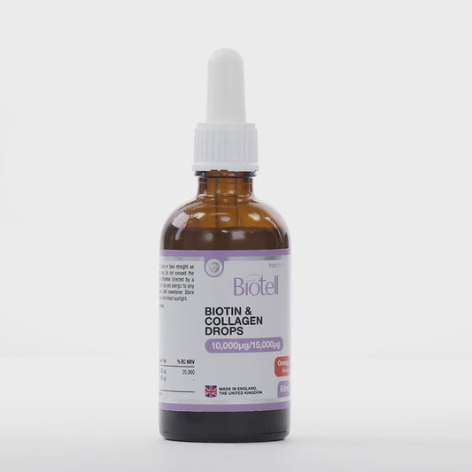 Support healthy hair, glowing skin, and strong nails with Biotell Biotin & Collagen Drops. 10,000μg Biotin and 15,000μg Collagen in a high-strength, easy-to-absorb liquid formula.