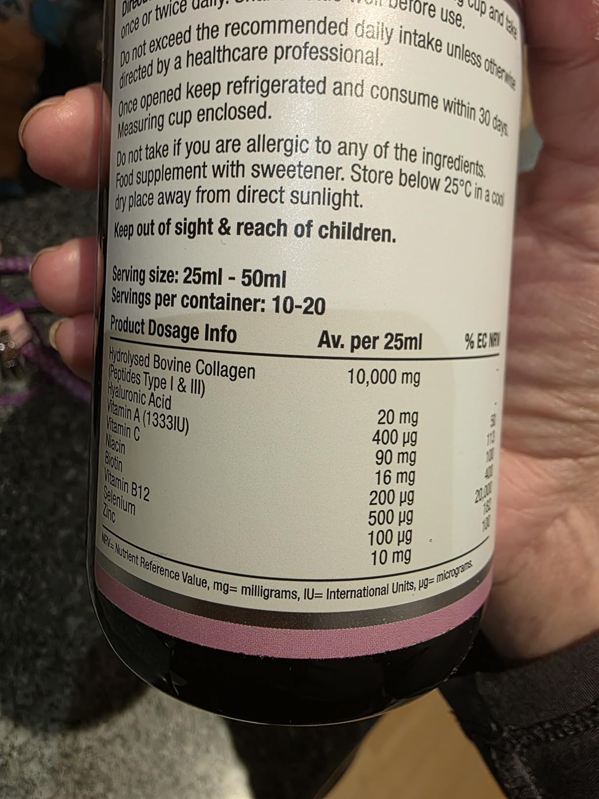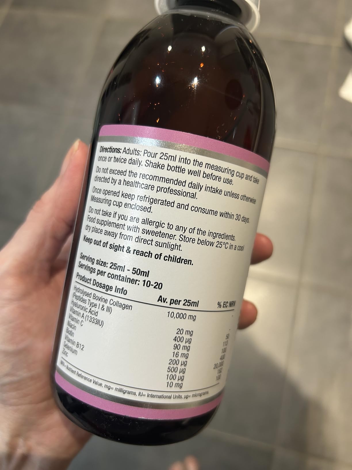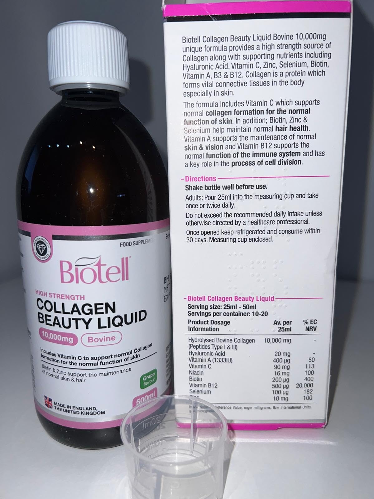 This seems like a really great quality liquid collagen supplement. You get approximately 20 servings (based on the recommended daily 25ml serving) that comes in a dark glass bottle. It contains a high dose of bovine collagen, plus a bunch of additional vitamins including vitamin c, biotin and zinc.The grape flavour is really delicious! I enjoy taking it by itself but it can easily be mixed into a drink. The best before date is over 2 years after the day of purchase. I haven’t been taking it long enough to comment on results but I am happy with the quality of this product and am really enjoying the taste. I think it is good value and I would happily recommend it :)