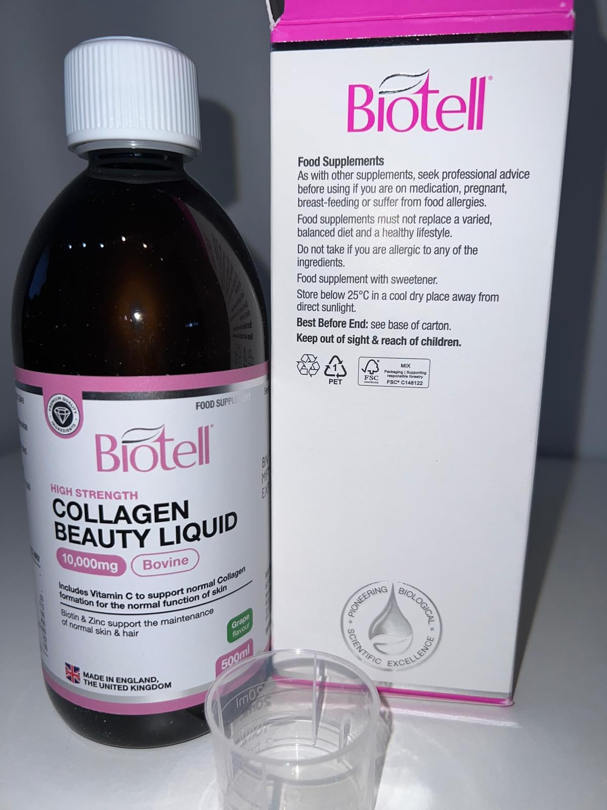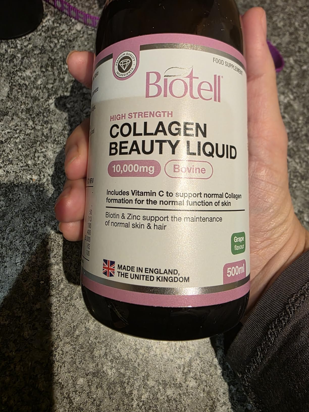 At 10,000mg per serving, this is definitely on the higher end compared to many collagen supplements, and it also includes vitamin C, hyaluronic acid and biotin, which makes it feel like a more complete blend rather than just a basic collagen product.The liquid format is convenient as well. There’s no mixing or swallowing tablets — you just measure out your daily dose and take it, which makes it easy to stay consistent. It comes with a measuring cup, which is a nice touch and removes any guesswork.In terms of taste, this is where it becomes a bit more subjective. It’s marketed as grape flavour, but it doesn’t really taste like a typical fruity drink. It’s slightly sweet with quite a thick consistency and a noticeable “collagen” aftertaste. It’s not unbearable, but it’s also not something you’d look forward to taking — more of a quick “take it and move on” situation.Digestion: I didn’t experience any negative side effects while taking it, and it felt gentle enough on the stomach for daily use, which is important with supplements like this.Energy level: There’s no immediate or noticeable boost in energy (which isn’t really the main purpose of collagen anyway), but it fits easily into a daily routine without causing any fatigue or discomfort.