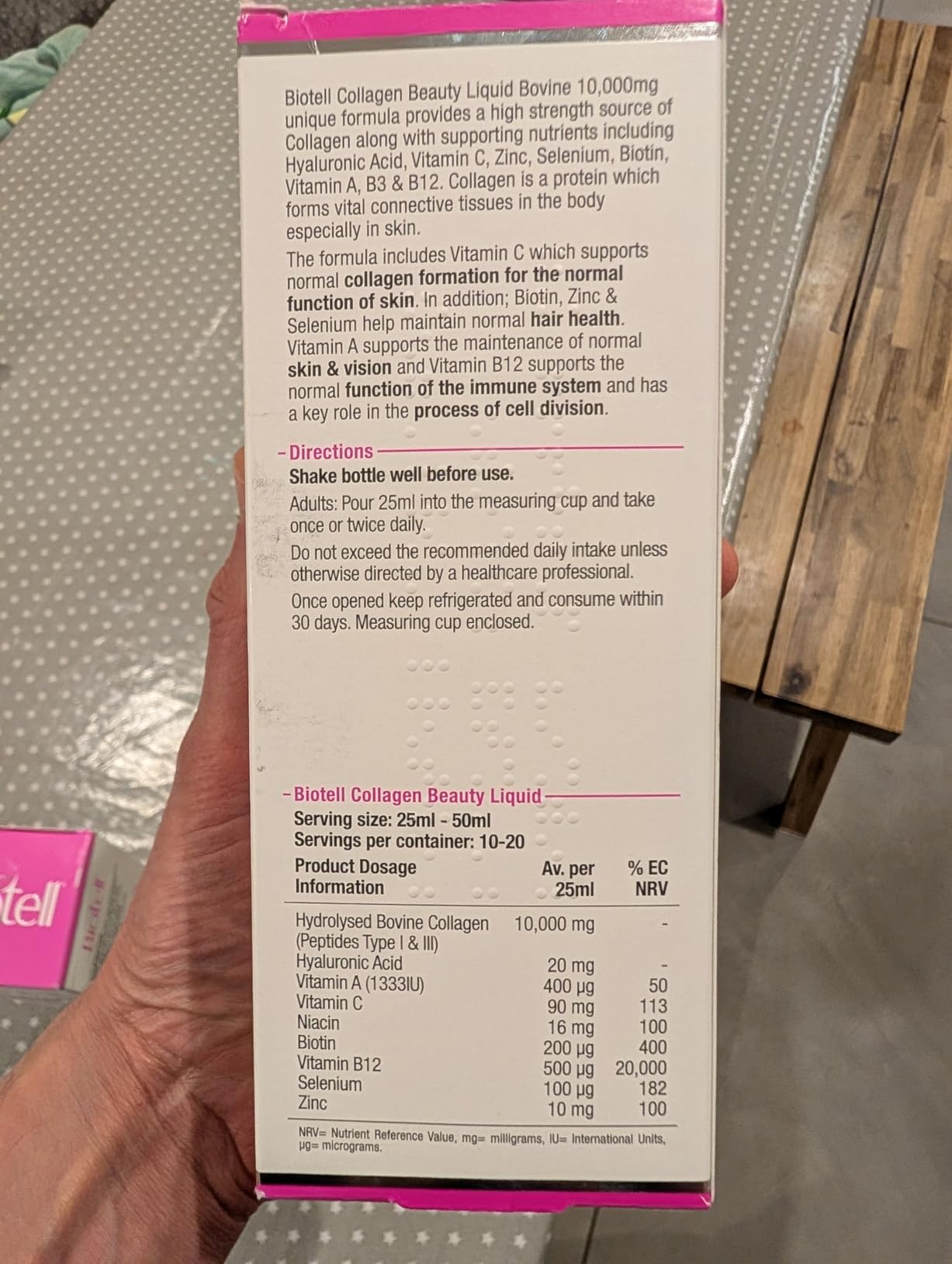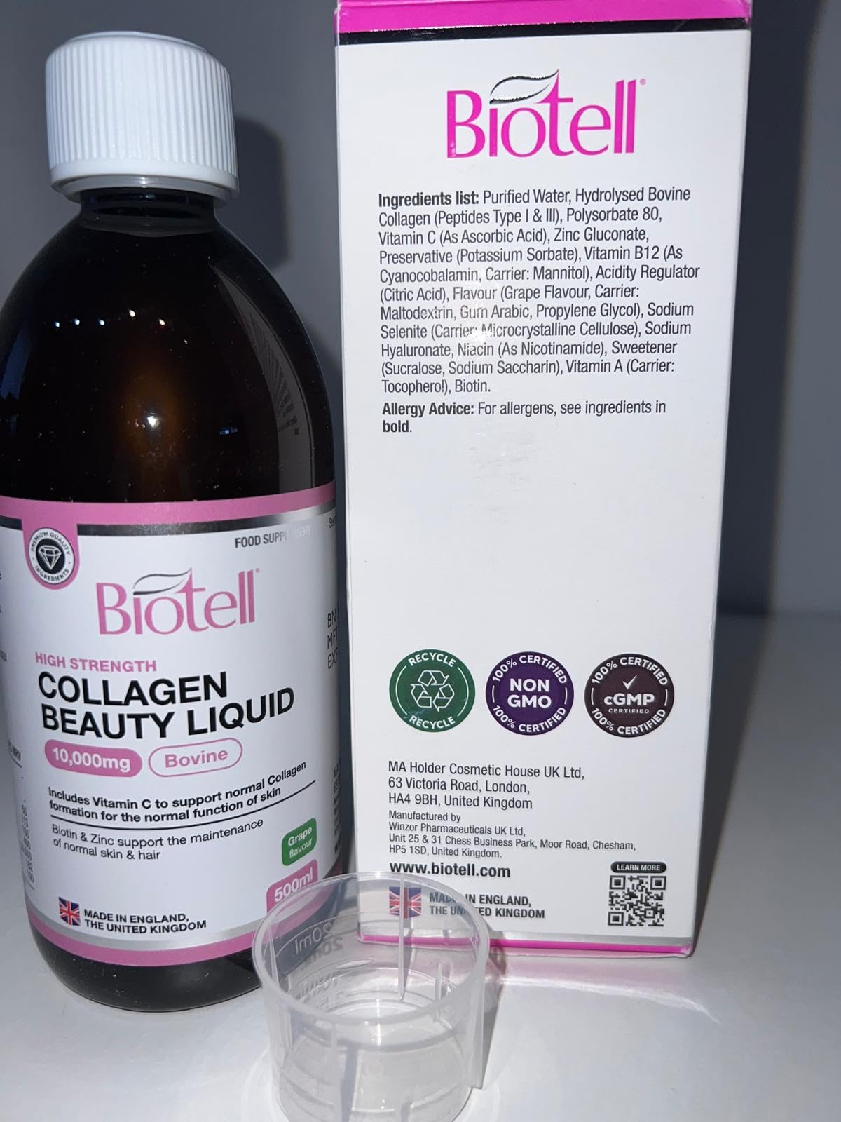The big tick for me is that it's UK made. This liquid collagen is a ready-to-drink beauty supplement is a high quality collagen with added vitamins: B12, vitamin A, Vitamin C, and hyaluronic acid. It comes with a measuring cup. You take 25ml daily. It has a slightly fruity taste which is nice. The 10000ml bottle gives you around 20 servings. The taste doesn't remind me of grapes, and leaves an oily aftertaste.There is a QR code on the box that takes you to their website which is full of useful information and advice.