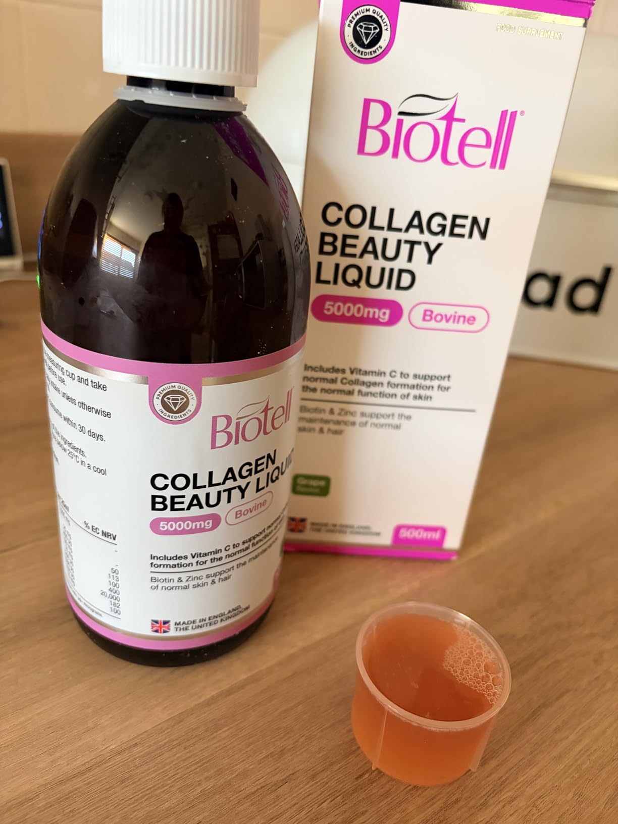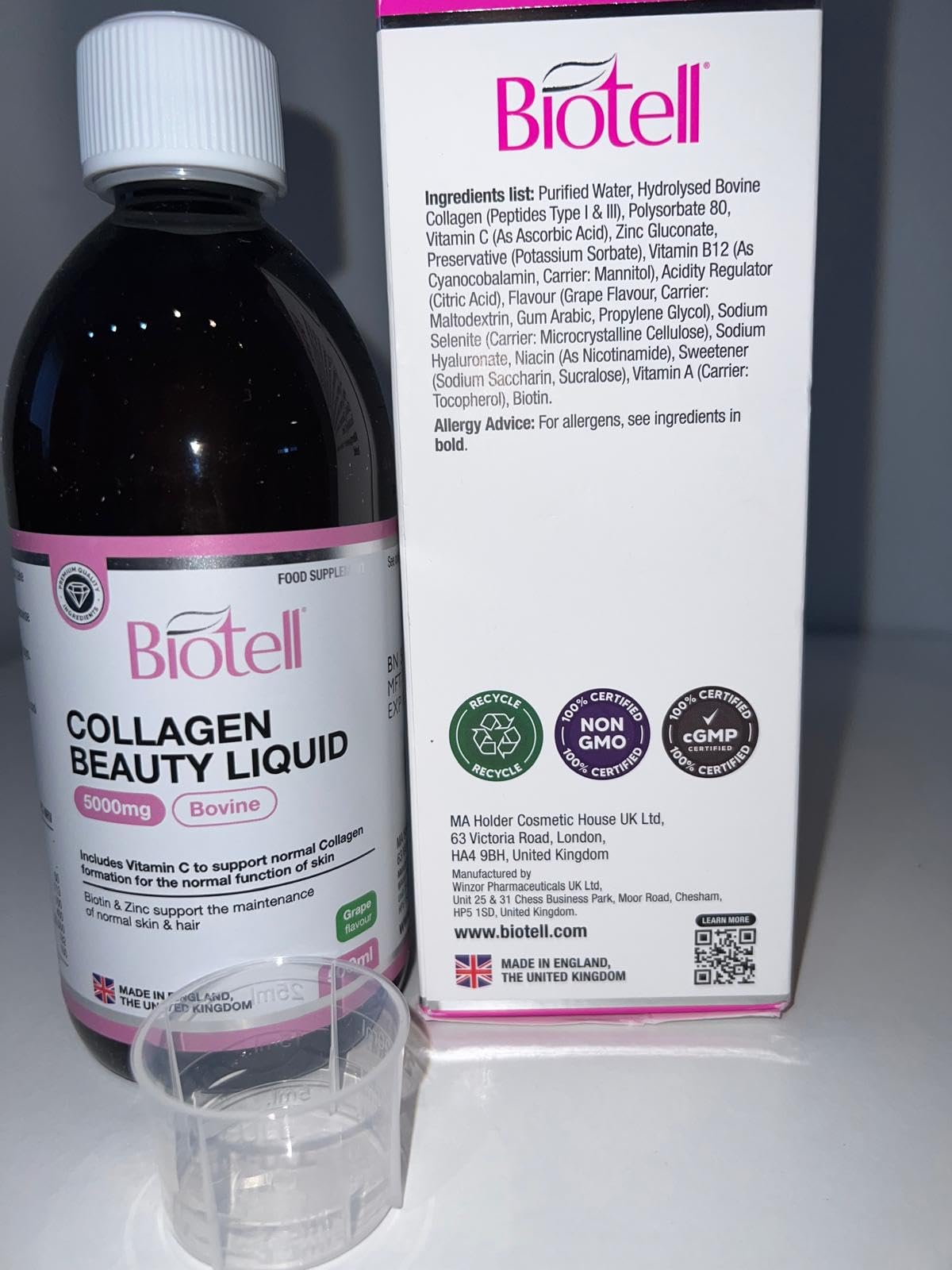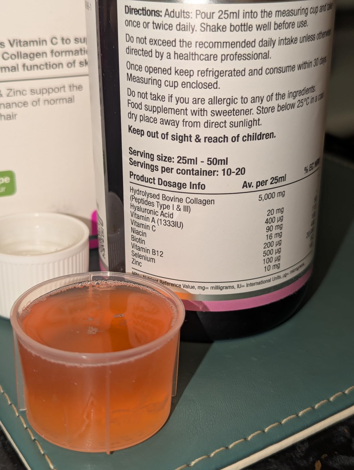The taste is a grape flavour but I do fine with most supplements the taste can have a weird ‘tang’, I put this down to the active ingredients, so it doesn’t put me off too much. I keep the bottle in the fridge so it can be quite thick when measuring into the cup each day. To make sure I don’t ‘miss’ any I top the little cup up with water to get the remaining liquid out each day.Taking 25ml a day you have 20 servings in the bottle which works out at £1.10 a day based on the current list price of £21.99. this may seem expensive compared to powdered collagen, but this is premixed and contains a range of other ingredients that are great for your skin and hair care routine.
