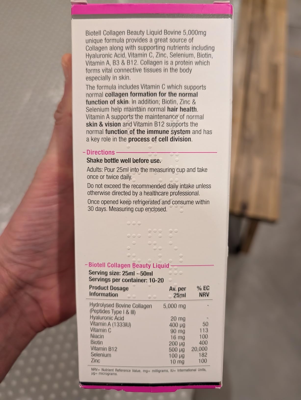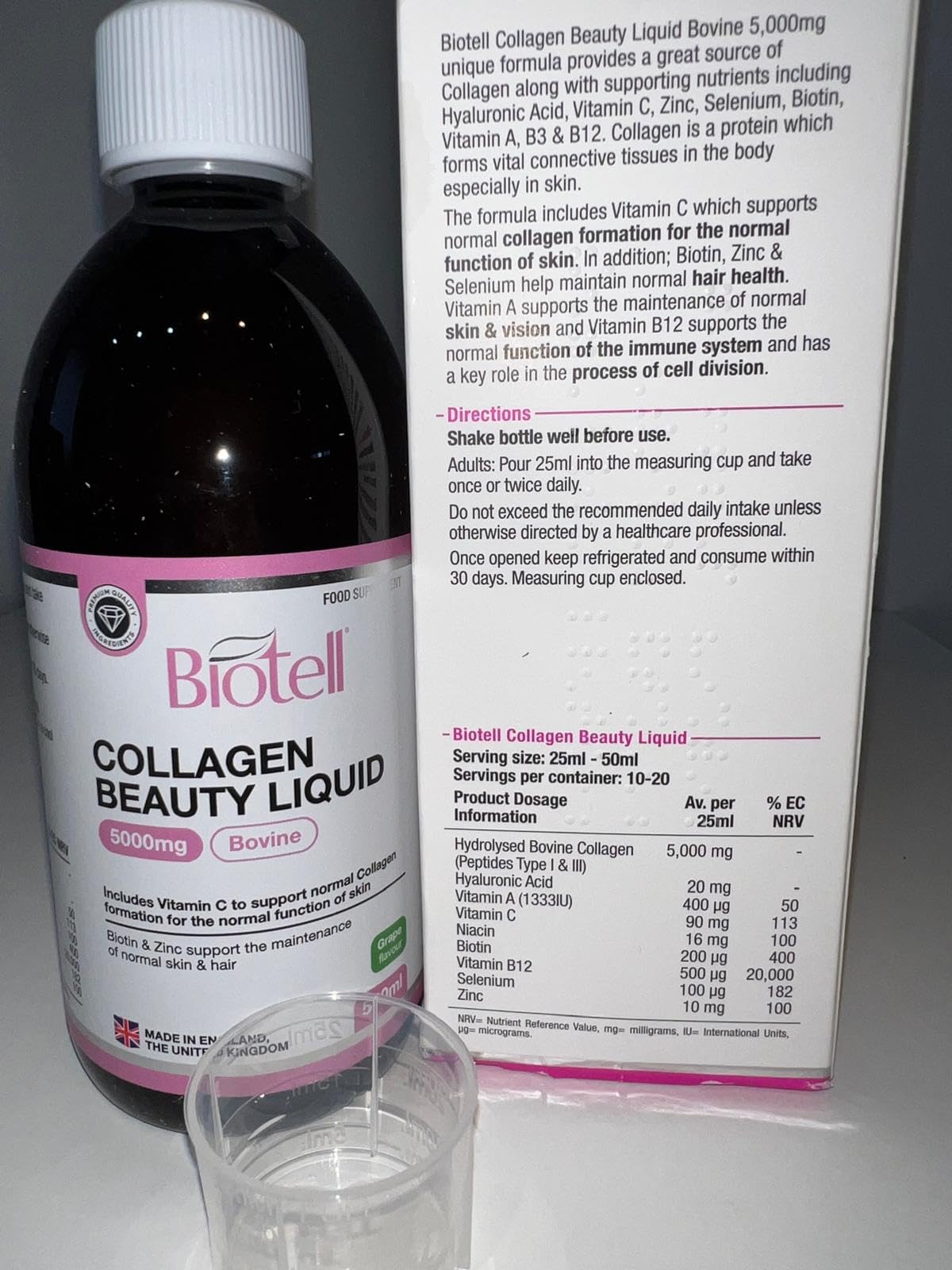 The collagen comes with a handy measuring cup, and 25ml provides 5,000mg. Its a thick liquid and although it's grape flavoured, if I'm completely honest, I'm not overly fond of the flavour. Even my husband, who also takes it, tells me that he has to down it quickly due to the taste. I've definitely had nicer tasting collagen drinks.Once opened, the bottle needs to be kept in the fridge and overall it contains between 10 -20 doses depending on how much you prefer to take.